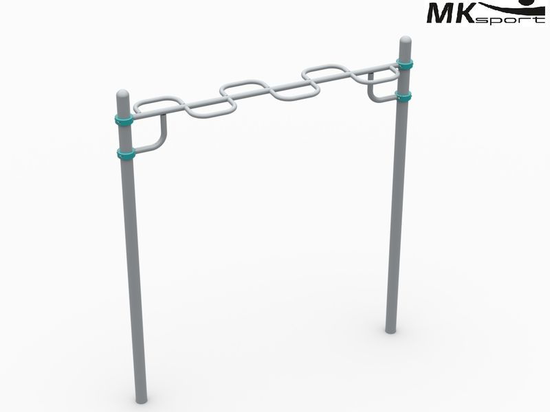 Упражнения на рукоходе укрепляют мышцы рук, спины и плеч, развивают ловкость и координацию. Все секции уличного рукохода расположены на одном уровне, что делает оборудование доступным для непрофессиональных спортсменов. Основные столбы и перекладина выполнены из стальных труб 89*3 и 42*3 мм. Змейка изготовлена из трубы 32*3 мм, что обеспечивает, с одной стороны, удобство хвата, а с другой – прочность и надежность конструкции. Цвет каркаса серый, хомуты бирюзовые.