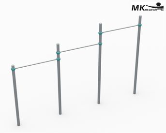 Турник – обязательный элемент любой воркаут-площадки. Он может быть использован для растяжки, разминки и выполнения упражнений подтягивания и подъема ног в висе. Наличие трех перекладин, установленных на разной высоте, позволяет использовать оборудование как взрослым, так и детям. Каркас выполнен из стальных труб 89*3 мм и перекладины 32*3 мм. Фиксация элементов производится с помощью стальных хомутов. Основной цвет изделия серый, хомуты бирюзовые.