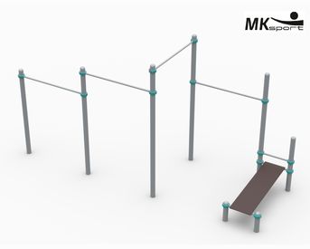 Для производства каркаса используются стальные столбы 89*3 мм, что является оптимальным вариантом для уличных спортивных комплексов. Они обеспечивают прочность и надежность конструкции, но существенно не увеличивают стоимость оборудования. Сверху основные столбы закрыты металлическими заглушками, скамья покрыта слоем ламината, что обеспечивает влагостойкость конструкции и защиту от атмосферных осадков. Крепление перекладин к основным столбам осуществляется с помощью стальных хомутов, устойчивых к деформации. Каркас комплекса покрыт цинкосодержащим грунтом и порошковой полимерной краской.