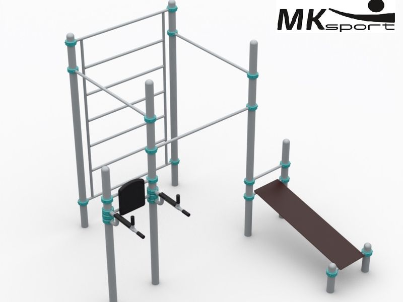 Главное преимущество данного спортивного комплекса состоит в его компактности и многофункциональности. На небольшой площадке становится возможным разместить сразу 5 разных снарядов: несколько турников, шведскую стенку, скамью для пресса, брусья для отжиманий и упор для пресса. Таким образом комплекс может быть использован не только для тренировки любых групп мышц, но и для растяжки и разминки. Основные столбы изготовлены из труб 89*3 мм, перекладины из труб 32*3 мм, материал скамьи – влагостойкая ламинированная фанера, спинка и подлокотники выполнены из пластика. Стандартный цвет каркаса серый, хомуты бирюзовые.