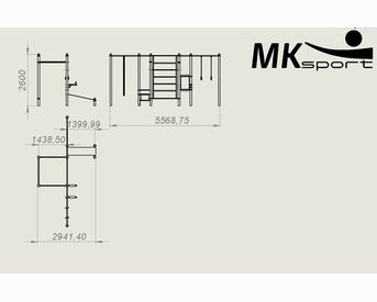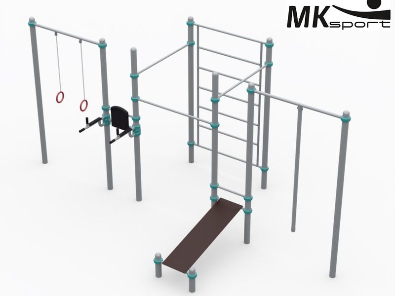 Уличный многофункциональный воркаут-комплекс включает в себя следующие снаряды: разноуровневые турники, шведскую стенку, лавку для пресса, упор для пресса и отжиманий, кольца и канат. Таким образом оборудование может быть использовано для тренировки любых групп мышц, растяжки и разминки. Основные столбы изготовлены из круглых труб 89*3 мм. Перекладины, турники и шведская стенка выполнены из стальных труб 32*3 мм. Спинка и подлокотники упора для пресса пластмассовые, материал скамьи – влагостойкая ламинированная фанера. Кольца и канат входят в стандартную комплектацию. Цвет комплекса серый, хомуты бирюзовые.