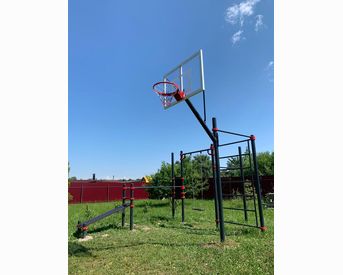 Баскетбольная стойка может быть использована в качестве одного из элементов воркаут-площадки, а также как одиночный снаряд в рамках любой спортивной площадки. Таким образом можно организовать во дворе целое баскетбольное поле или просто установить стойку для тренировки бросков в корзину и игр с мячом на одно кольцо. Каркас снаряда изготовлен из круглой трубы 89*3 мм, баскетбольный щит из поликарбоната 10 мм. Кольцо антивандальное. Опорная труба серая, стрела выноса бирюзовая.