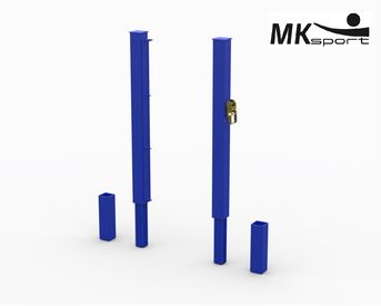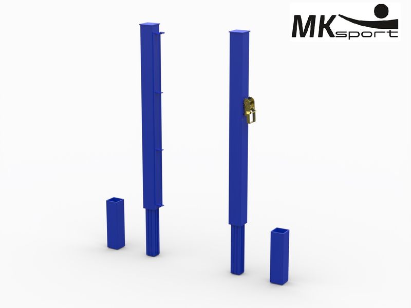 Стойки – обязательный атрибут теннисного корта, они организуют игровое поле и обеспечивают стабильное напряжение сетки. Данная модель выполнена из стальных профилей с квадратным сечением 80*80 мм и толщиной стенки 3 мм. Одна из стоек оснащена храповым механизмом натяжения сетки. Стойки устанавливаются на стаканы, которые бетонируются в грунт. Сверху опоры закрыты металлическими заглушками, обеспечивающими защиту от попадания влаги и мусора внутрь конструкций. Стандартный цвет оборудования синий.